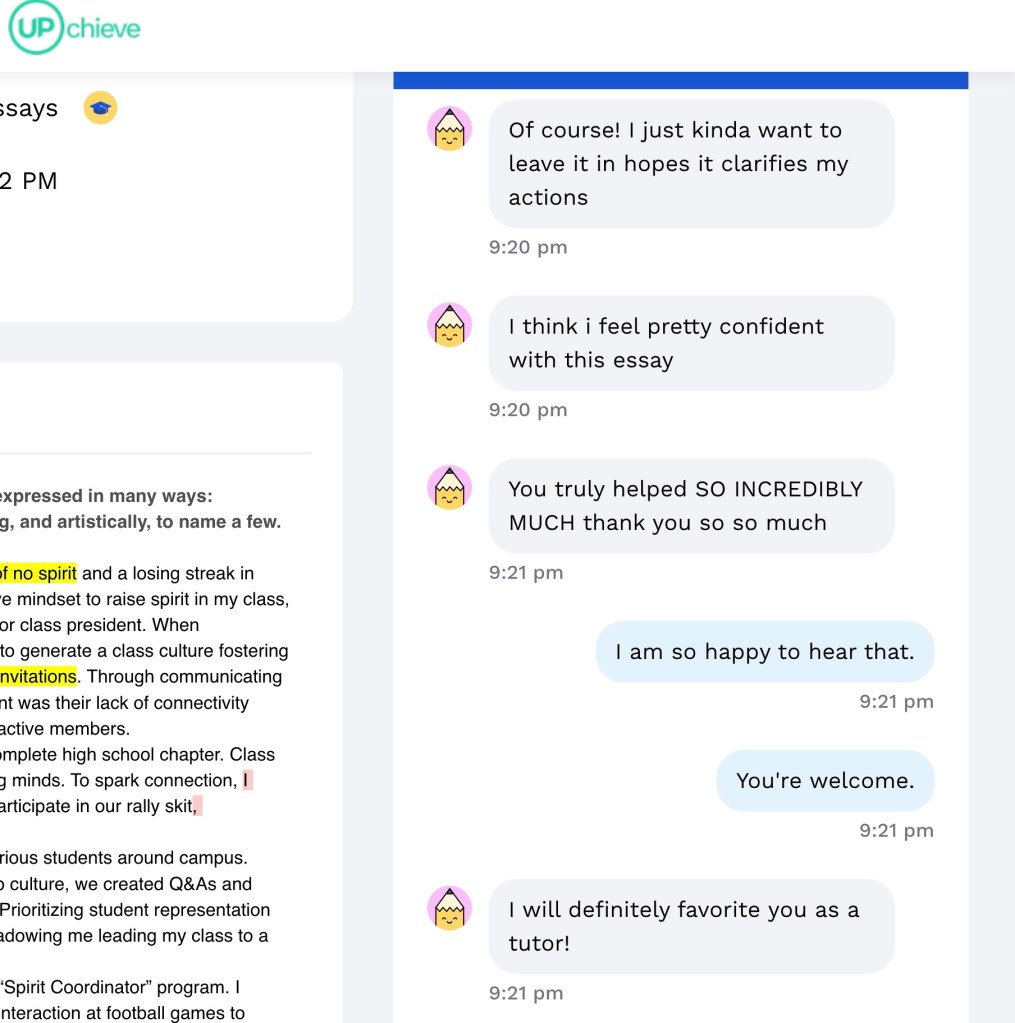 After a different free tutoring session on Upchieve, another tutoring client wrote “You truly helped SO INCREDIBLY MUCH. thank you so so much. I will definitely favorite you as a tutor!”